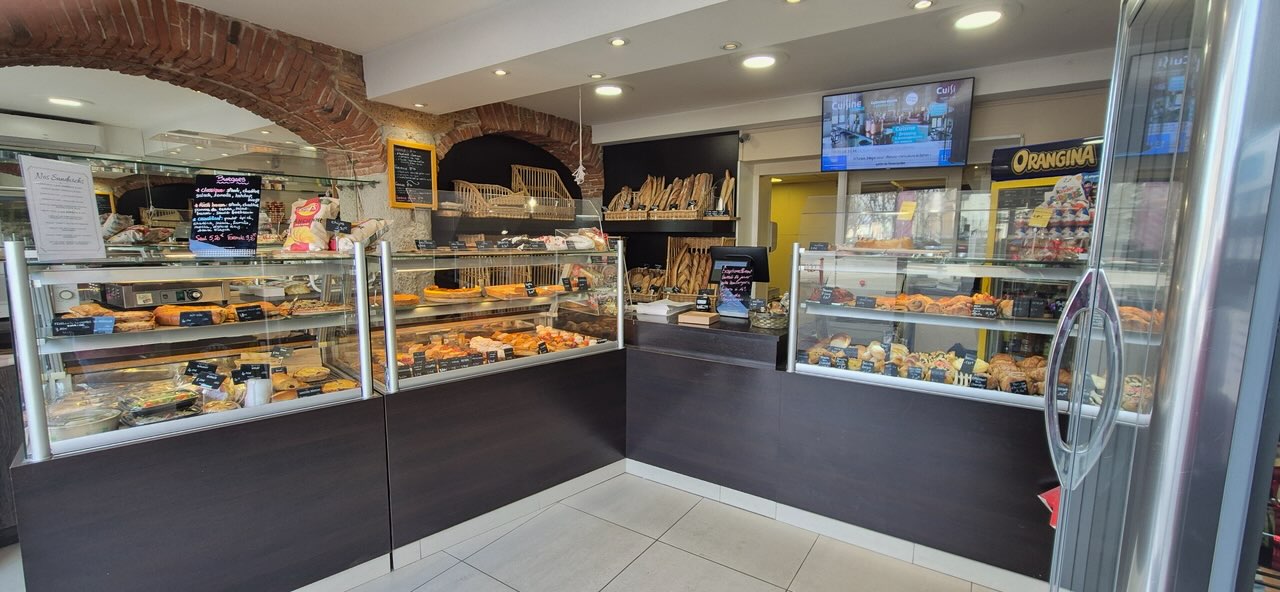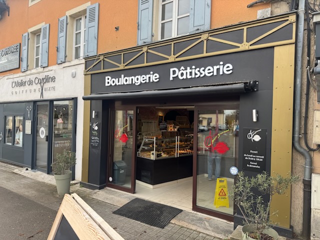 Boulangerie située sur la place centrale du village avec de nombreuses places de parking.